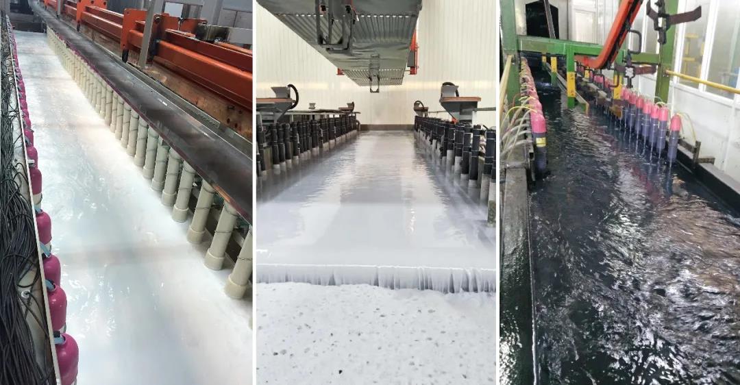 4. 檢修陽極系統(tǒng):檢查陽極膜是否漏、堵,陽極(不銹鋼、板)是否出現(xiàn)腐蝕生銹嚴(yán)重、極管(框)是否變形破損、陽極液循環(huán)管流量情況,對(duì)異常的陽極系統(tǒng)進(jìn)行清洗更換修復(fù);如陽極系統(tǒng)有生細(xì)菌情況,需要使用雙氧水等進(jìn)行殺菌處理(注意安全防護(hù))。在停產(chǎn)期間,可將陽極液排放,加入純水,使陽極膜處于潤(rùn)濕狀態(tài),防止陽極液泄露進(jìn)入電泳槽液以及陽極膜干燥出現(xiàn)堵膜情況;