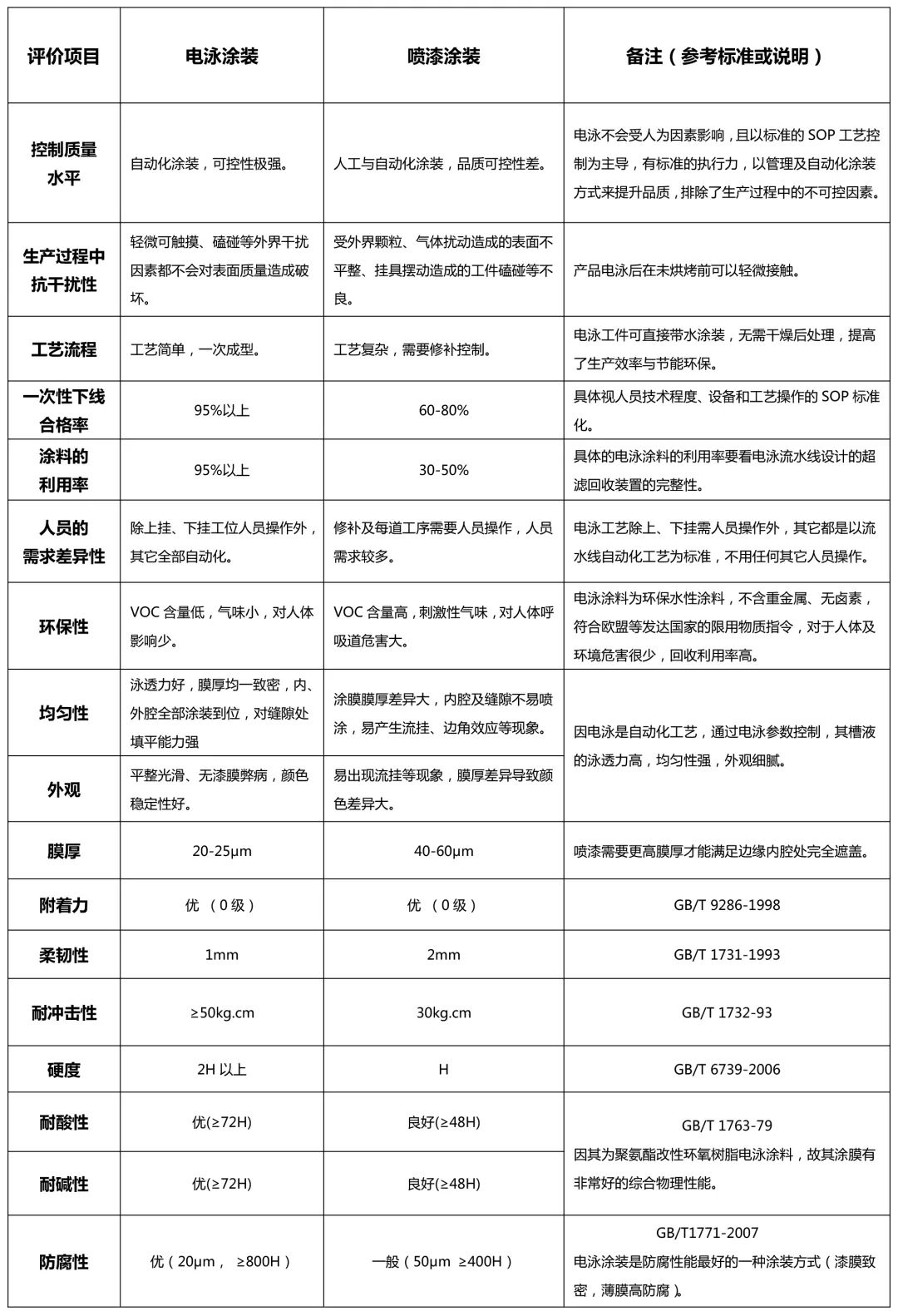 電泳與噴漆涂裝綜合比較表