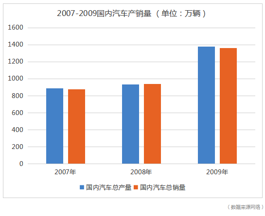 2007年,國內(nèi)汽車總產(chǎn)量888.24萬輛,總銷量879.15萬輛;2008年,分別為934.5萬輛和938.05萬輛;2009年為1379.1萬輛和 1364.48萬輛。