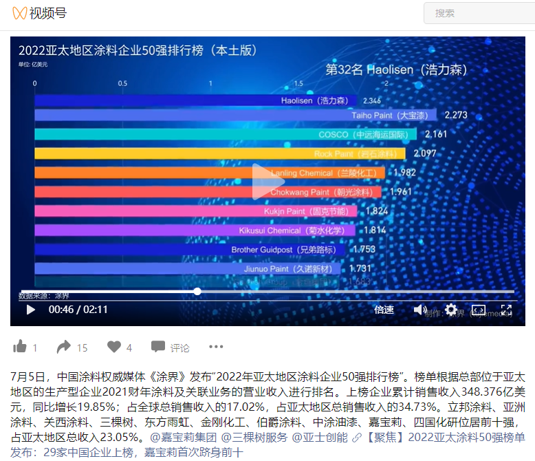 2022亞太地區(qū)涂料企業(yè)50強排行榜正式發(fā)布——浩力森居排行榜第32名
