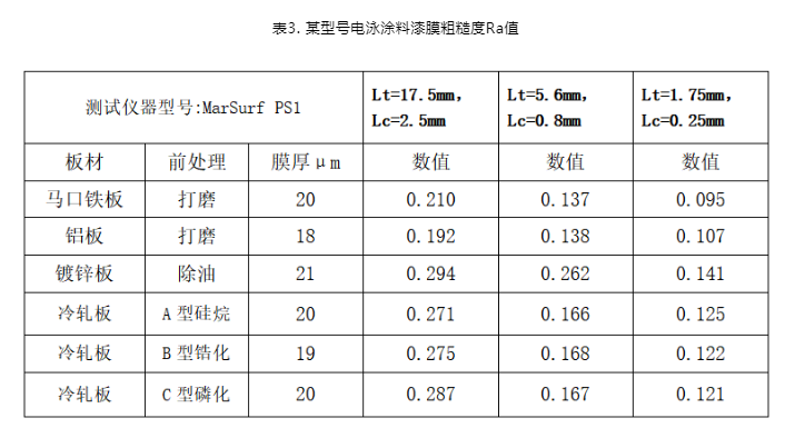 電泳涂料在不同金屬基材上電泳沉積形成電泳漆膜,受到板材基材粗糙度影響、前處理皮膜粗糙度影響,以及在不同基材和前處理皮膜上導(dǎo)電特性差異導(dǎo)致的電沉積差異性、以及電泳涂料自身的流平特性差異,最終的電泳漆膜會(huì)測(cè)的不同的粗糙度Ra,其數(shù)據(jù)展示如下: