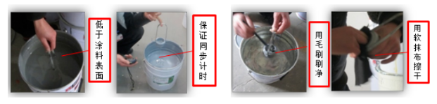 01 除油:毛巾沾取除油劑擦拭除油。使用時,毛巾先對折三次,保證毛巾的利用率,嚴禁將毛巾團成一團來回擦拭。擦拭時都必須有方向性,或從左向右,或從上往下,不能來回拉動,造成二次污染。表面的飛濺物以及邊、角、楞、死角處的顆粒等需用鏟刀清除干凈。除油后表面用手觸摸無油膩感。
