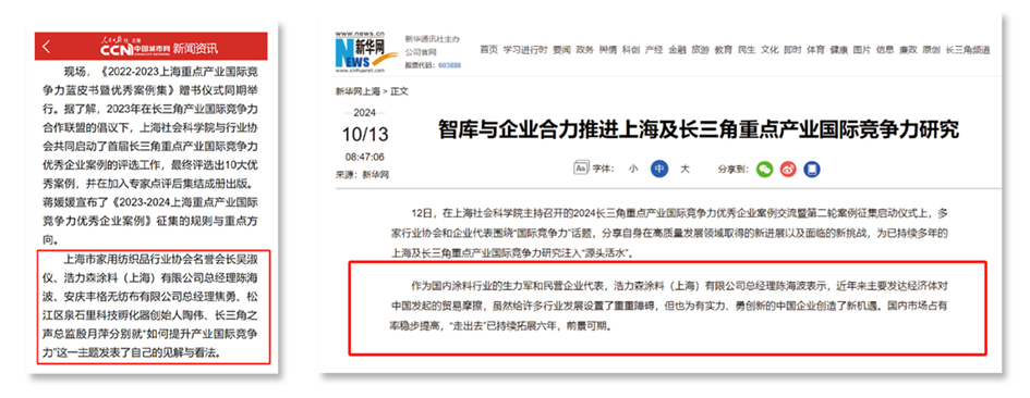 近日,浩力森受邀參加了由上海市商務(wù)委員會(huì)支持、上海社會(huì)科學(xué)院主辦的2024長三角重點(diǎn)產(chǎn)業(yè)國際競(jìng)爭(zhēng)力優(yōu)秀企業(yè)案例交流暨第二輪案例征集啟動(dòng)儀式。 . 據(jù)悉,2023年,在長三角產(chǎn)業(yè)國際競(jìng)爭(zhēng)力合作聯(lián)盟的倡議下,上海社會(huì)科學(xué)院與行業(yè)協(xié)會(huì)共同評(píng)選出了首屆長三角重點(diǎn)產(chǎn)業(yè)國際競(jìng)爭(zhēng)力優(yōu)秀企業(yè)案例,共有10大案例脫穎而出,并在加入專家點(diǎn)評(píng)后集結(jié)成書。同時(shí),會(huì)上還公布了《2023-2024上海重點(diǎn)產(chǎn)業(yè)國際競(jìng)爭(zhēng)力優(yōu)秀企業(yè)案例》的征集規(guī)則與重點(diǎn)方向。 人民日?qǐng)?bào) / 新華網(wǎng) 此次會(huì)議吸引了包括人民日?qǐng)?bào)、新華網(wǎng)、文匯報(bào)、解放日?qǐng)?bào)在內(nèi)的眾多國家級(jí)主流媒體的高度關(guān)注與廣泛報(bào)道。 作為國內(nèi)涂料行業(yè)的生力軍和民營企業(yè)代表,浩力森的代表在會(huì)上衷心感謝上?;ば袠I(yè)協(xié)會(huì)的活動(dòng)邀請(qǐng),并進(jìn)一步指出,近年來,主要發(fā)達(dá)經(jīng)濟(jì)體對(duì)中國發(fā)起的貿(mào)易摩擦確實(shí)給行業(yè)發(fā)展帶來了不少挑戰(zhàn),但同時(shí)也為那些有實(shí)力、勇于創(chuàng)新的中國企業(yè)帶來了新的機(jī)遇。 . 浩力森憑借自身的實(shí)力和創(chuàng)新精神,在國內(nèi)市場(chǎng)的占有率穩(wěn)步提高,同時(shí),“走出去”戰(zhàn)略也已持續(xù)實(shí)施了六年,前景十分廣闊。