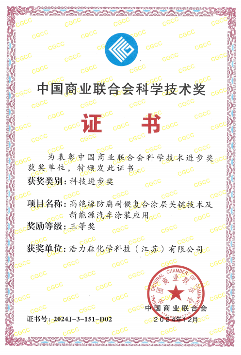 在新能源汽車產(chǎn)業(yè)蓬勃發(fā)展的浪潮中,安全與品質(zhì)始終是行業(yè)繞不開的核心命題。當電池熱失控、車身腐蝕等隱患成為制約行業(yè)發(fā)展的痛點時,浩力森憑借其突破性的《高絕緣防腐耐候復合涂層關(guān)鍵技術(shù)及新能源汽車涂裝應(yīng)用》項目,不僅為新能源汽車安全提供了關(guān)鍵解決方案,更以行業(yè)標桿之姿斬獲2024年度中國商業(yè)聯(lián)合會科學技術(shù)獎三等獎,成為科技賦能產(chǎn)業(yè)升級的典范。